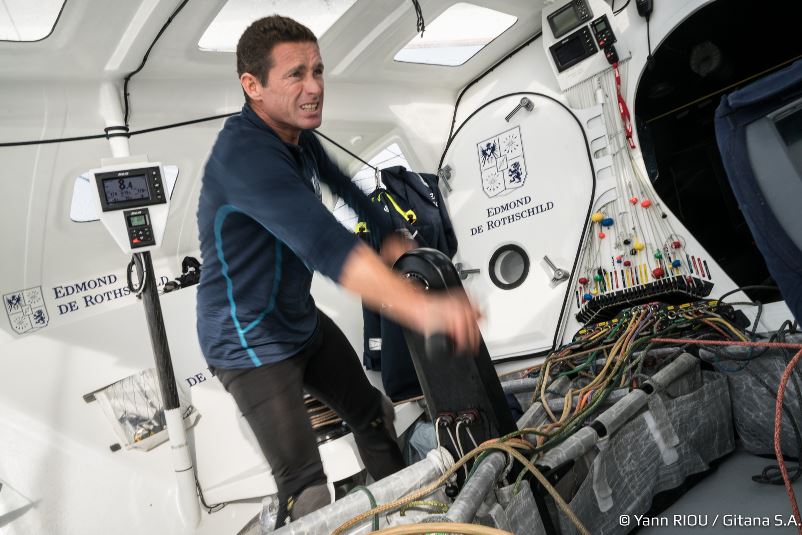 A total of 1,460m2 of sail area powers the Mono60 Edmond de Rothschild. Though the progress made in the materials used has reduced the weight of the sails, there is still a significant number of them (a maximum of 9 sails permitted) and an abundance of possible sail combinations. The trimming is constant and the manœuvres punctuate the days and the nights. Tacking or gybing can take up to 35/40 minutes for example and is accompanied by a complete relocation of the gear stowed down below, with no less than 250 kilos to be shifted from one side of the boat to the other. Changing a headsail equates to several trips backwards and forwards from the cockpit to the bow, before an arduous run at the coffee grinder (upright winching mechanism).