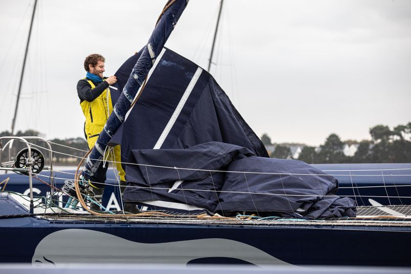 Credited with an 18-mile lead over the Coville-Nélias duo at 15:00 UTC yesterday, this Tuesday at the same time, the Maxi Edmond de Rothschild was some 66 miles ahead of Sodebo Ultim’. Completing the trio making up the Ultime category, Prince de Bretagne is struggling somewhat with a 295-mile deficit in relation to Gitana 17. This figure can be explained by the differences in size and the technology aboard the two trimarans, but also the crew announced this morning that they’d snapped the mainsail halyard as the front rolled through. This damage isn’t damning for the next stage of the race, but Lionel Lemonchois and Bernard Stamm will be handicapped over the coming hours.